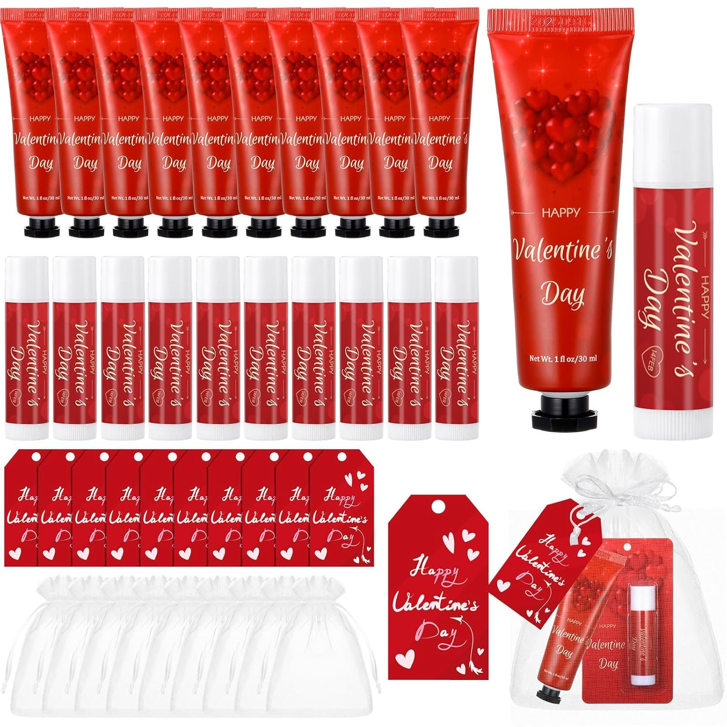 30 Sets Valentine’s Day Hand Cream and Lip Balm Gift Bulk for women Romantic Love Heart Gifts with Organza Bag, Tag, Valentine Party Favors for family Teacher Nurse Coworker